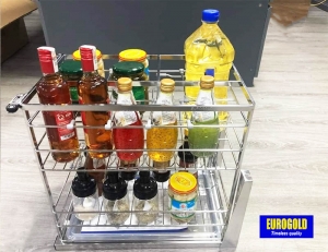 Với thiết kế bộ ray giảm chấn đi kèm với kệ gia vị giúp cho bạn lắp âm tủ bếp và kéo ra bên ngoài 1 cách dễ dàng. Ray giảm chấn có khả năng chịu được 40kg, thả ga cho bạn để đồ không lo quá tải