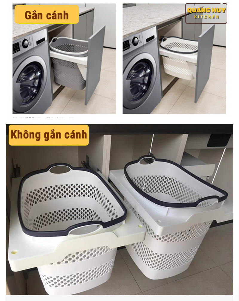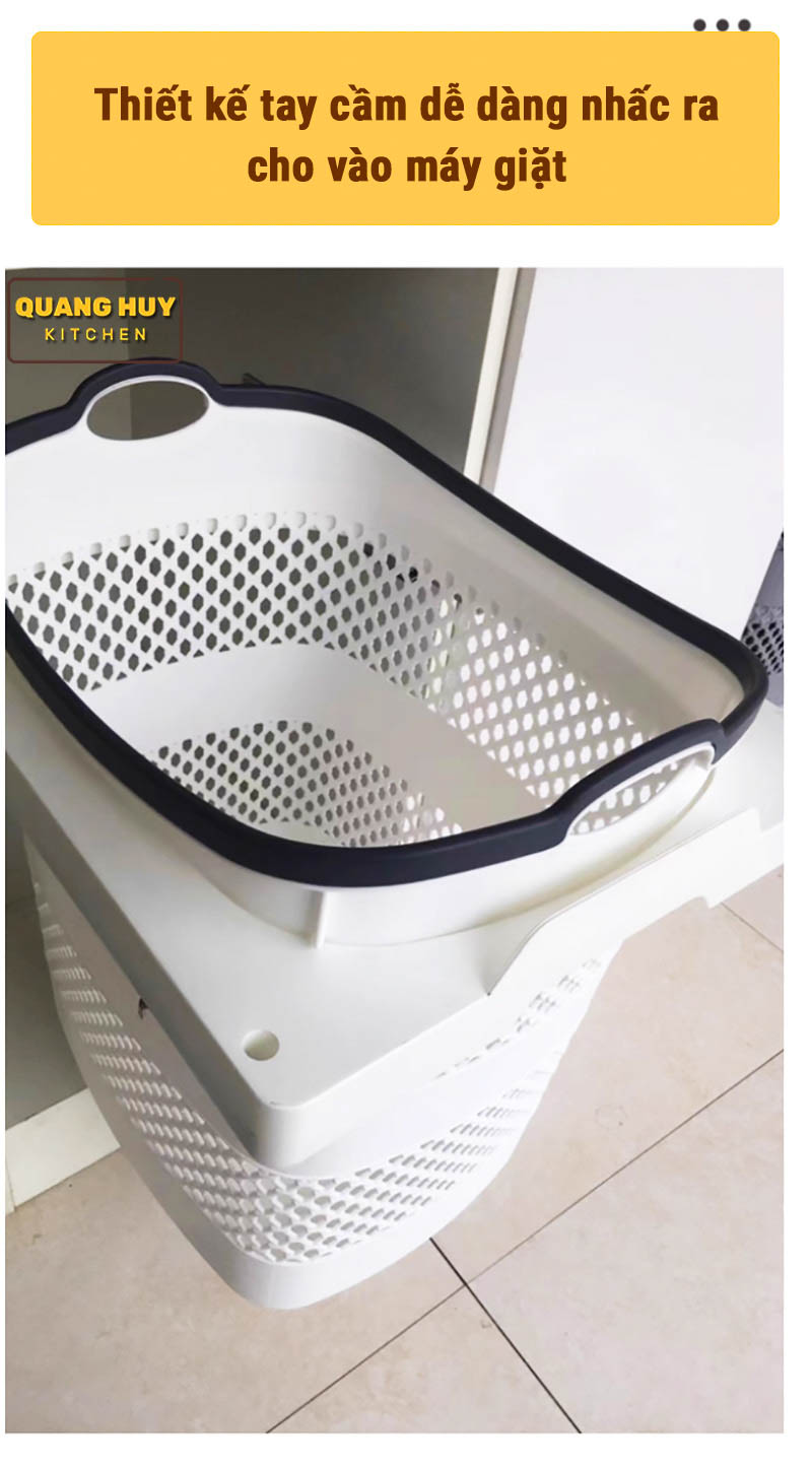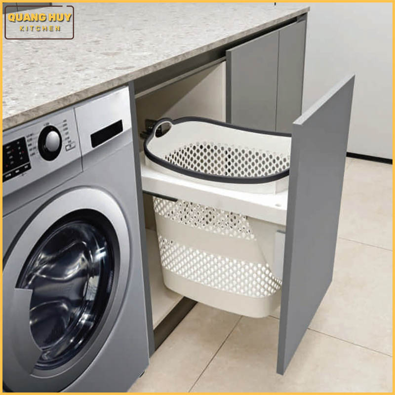 Với thiết kế tay cầm giúp bạn dễ dàng nhấc ra cho vào máy giặt hoặc là đi gom quần áo. Với những gia đình thiết kế tủ đồ cho máy sấy, máy giặt và giỏ kéo gần nhau bạn chỉ cần kéo giỏ và cho quần áo vào phía bên trong