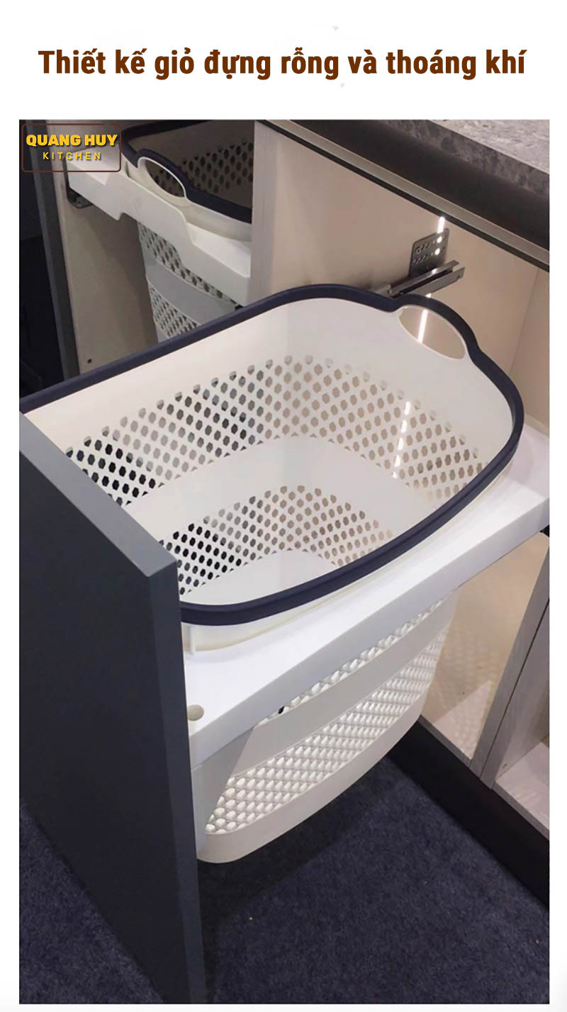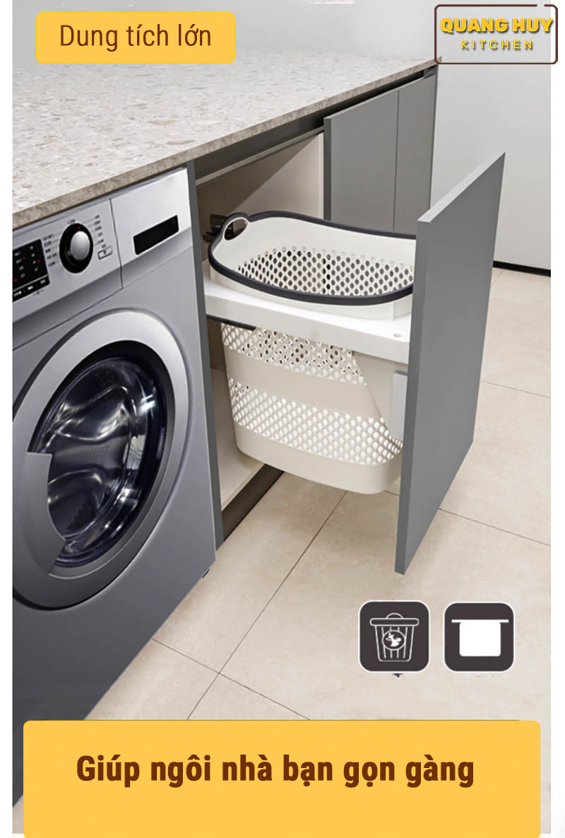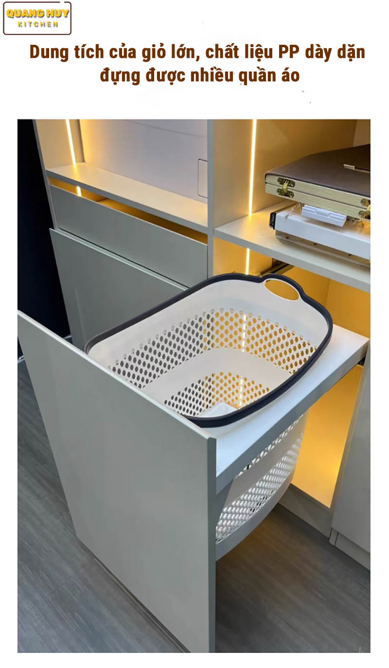Quần áo sau khi mặc thường dễ bừa bộn nếu không có chỗ để riêng. Giỏ đựng quần áo giúp bạn gom quần áo bẩn lại một chỗ, tránh tình trạng vứt rải rác khắp phòng ngủ, nhà tắm. Giỏ đựng này có tích hợp ray giảm chấn để bạn cất gọn bên trong khoang tủ 1 cách gọn gàng