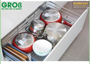 Kệ xoong nồi sở hữu tray giảm chấn tốt. Ray giúp bạn có thể kéo hẳn giá xoong nồi ra phía ngoài để lấy đồ và úp đồ dễ dàng hơn
