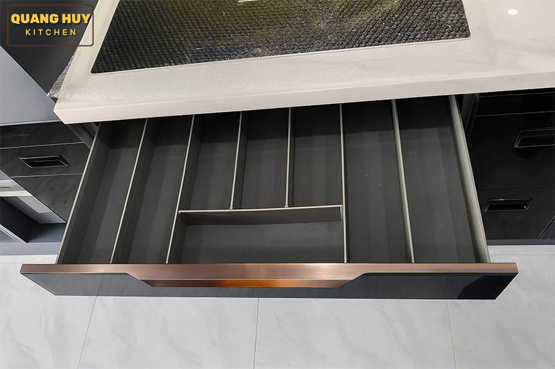Bạn có thể tận dụng khoang giá xoong nồi ở bên dưới bếp từ để lắp thêm 1 khay chia thìa dĩa. Điều này vô cùng hợp lý. Kích thước của giá xoong nồi là bao nhiêu thì chính là kích thước của khay chia thìa dĩa
